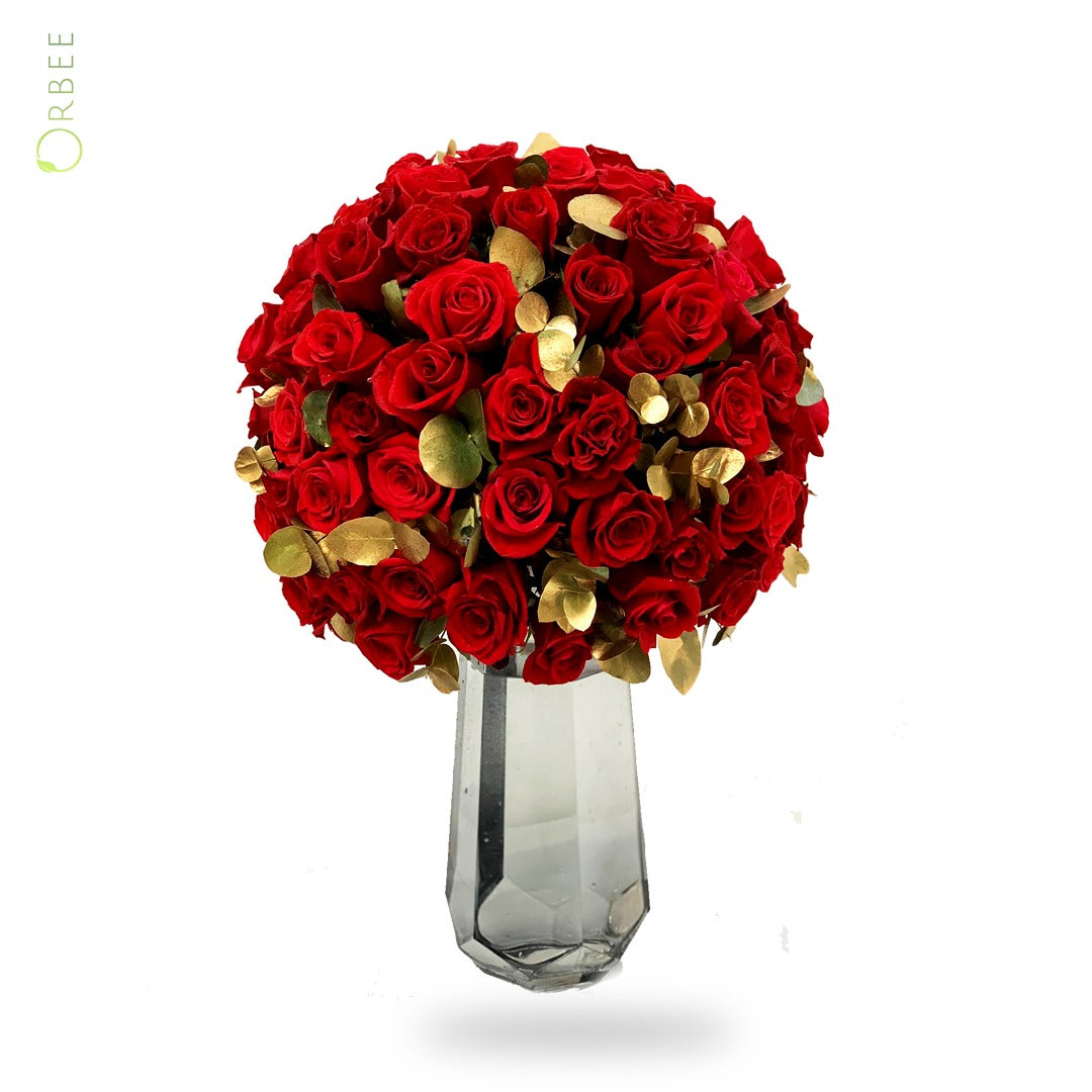 Introducing the "Alluring Beauty" Red Rose Arrangement, a masterpiece that encapsulates the intensity of red roses, enriched with the golden allure of delicate leaves, beautifully presented in a transparent glass vase. This arrangement is a testament to the fusion of passion and sophistication. The Alluring Beauty is a perfect gift for conveying heartfelt sentiments, celebrate special occasions, or adorn your space with sophistication.