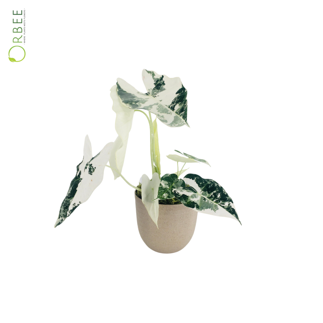 Alocasia Frydek, also known as Alocasia micholitziana 'Frydek', is a striking tropical plant prized for its deep green, velvety leaves with prominent white veins. The arrowhead-shaped leaves give the plant a bold, elegant look, making it a popular choice among houseplant enthusiasts. When paired with a cream-colored pot, the contrast between the rich green foliage and the soft, neutral tone of the pot creates a sophisticated and calming display.