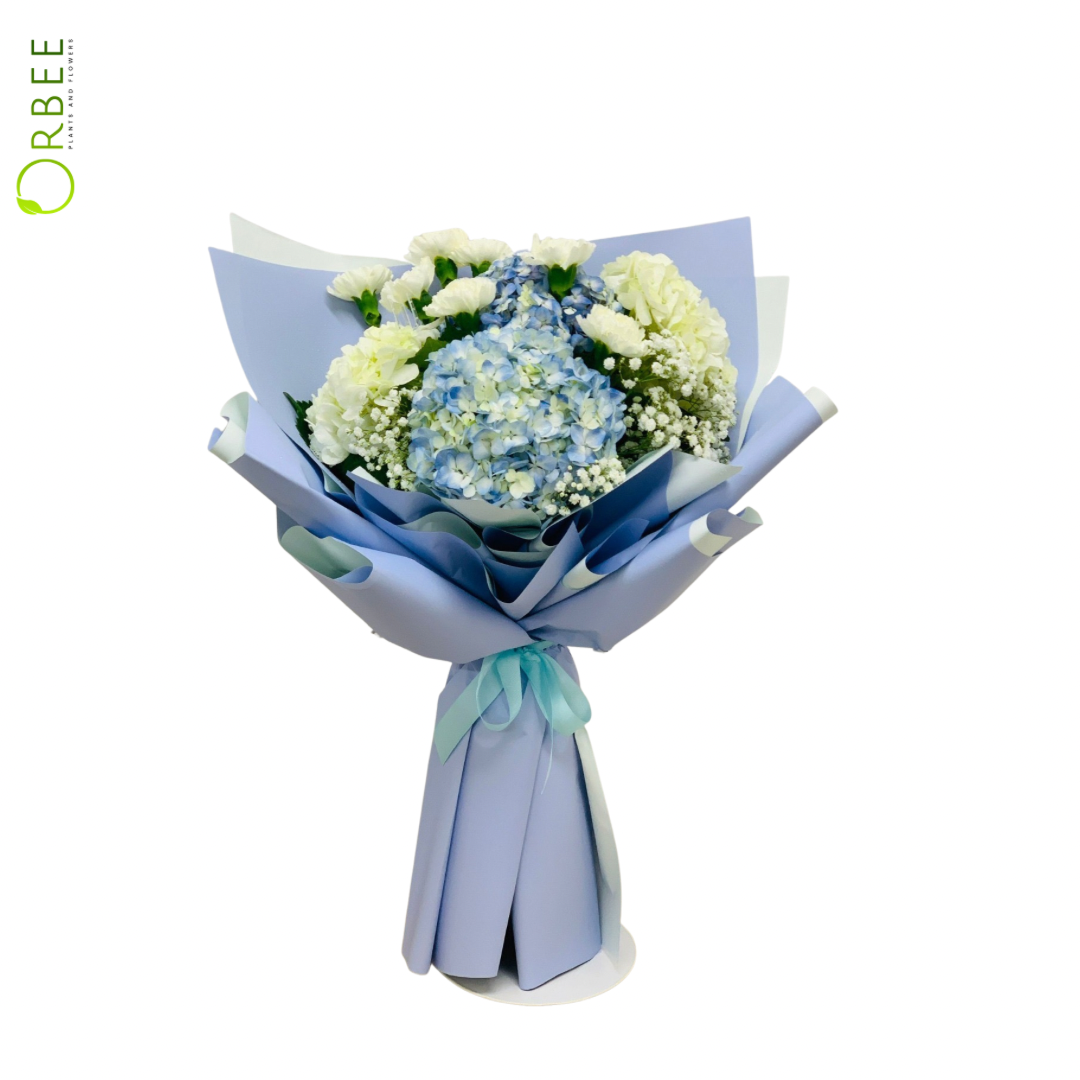 A dreamy blend of soft blue hydrangeas, elegant white carnations, and delicate baby’s breath, this bouquet captures serenity and charm in every bloom. Wrapped in pastel blue with a matching ribbon, it radiates freshness and sophistication. Perfect for birthdays, new beginnings, baby showers, or simply to brighten someone’s day, this bouquet is a thoughtful way to express love, care, and warm wishes.