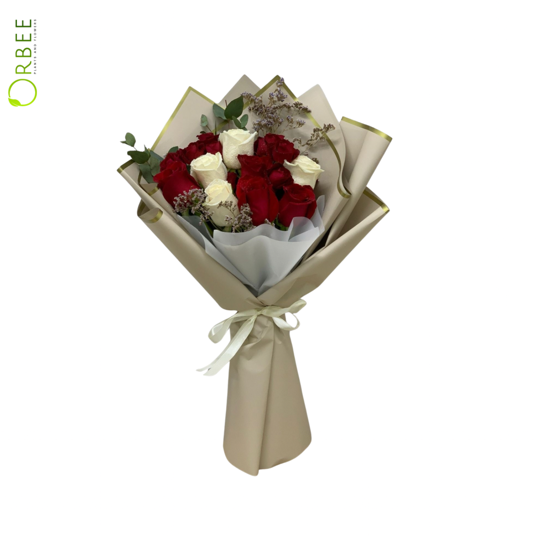 A timeless arrangement of red and white roses, delicately wrapped in soft beige paper and finished with a satin ribbon. This bouquet perfectly blends the passion of red roses with the purity of white, making it an ideal choice for romantic gestures, anniversaries, or special celebrations. Accented with fillers and greenery, it’s a sophisticated expression of love and elegance.