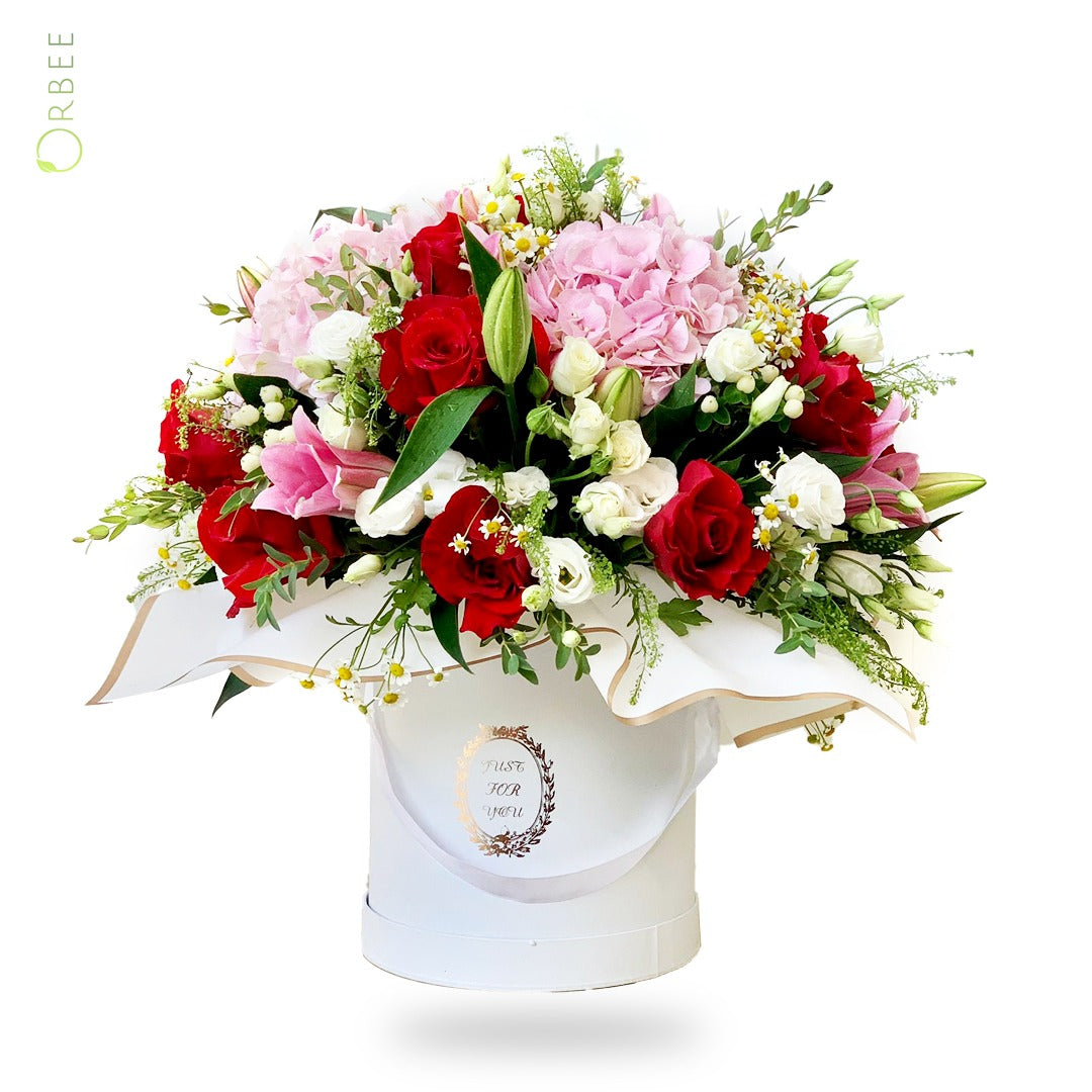 Description: 15 pc roses, 5 pc spray roses, 5 pc hypericums, 5 pc lisianthus, 5 pc tanacetums, 3 pc hydrangeas, 3 pc lilies, fillers of lepidiums and eucalyptus, with a big white flower box