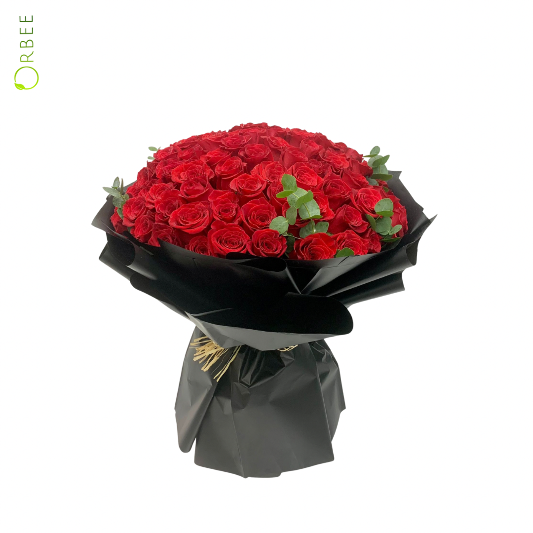 The Crimson Charm is a stunning bouquet of 100 red roses, expertly arranged with minimal green leaf fillers and wrapped in elegant sheet packaging. Perfect for any occasion, this bouquet will surely make a lasting impression.