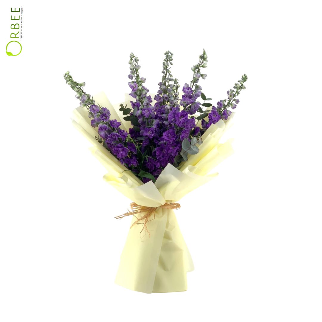 Elevate the charm of any occasion with our "Delightful Delphinium Ensemble." This exquisite bouquet features six stunning delphinium blooms, known for their tall spikes of vibrant, Purple petals. Each delphinium represents serenity, dignity, and a touch of garden elegance.