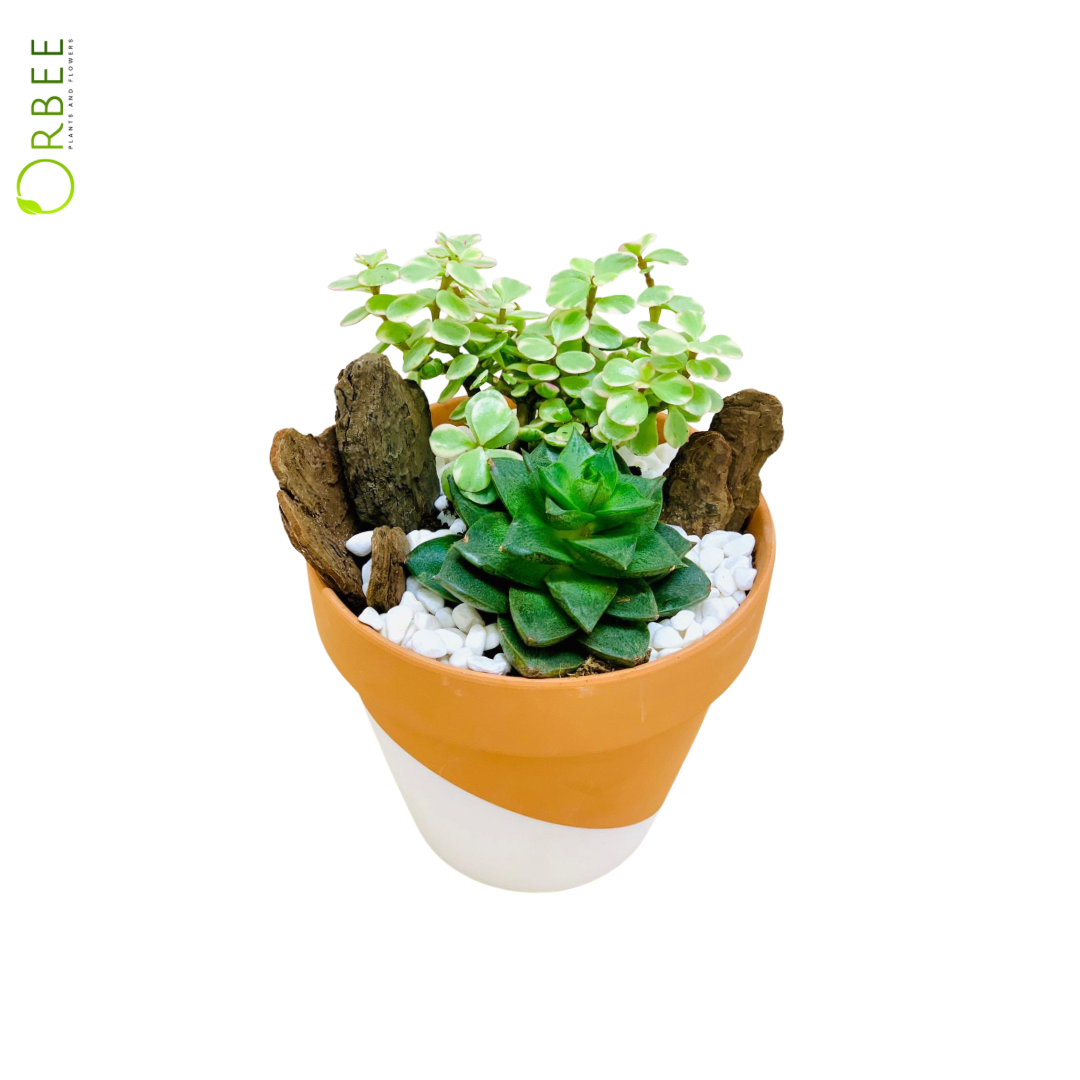 This vibrant succulent arrangement in a terracotta-and-white pot combines nature’s rustic beauty with modern minimalism. Featuring lush greens, crisp white stones, and natural wood accents, it’s a perfect pick to bring an earthy yet elegant vibe to any space.