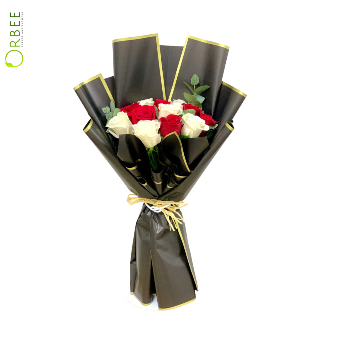 A stunning hand bouquet of 15 fresh roses, beautifully blending the passion of red and the purity of white. Wrapped in elegant black with golden accents, this arrangement symbolizes love, unity, and timeless grace — perfect for expressing heartfelt emotions on any special occasion.