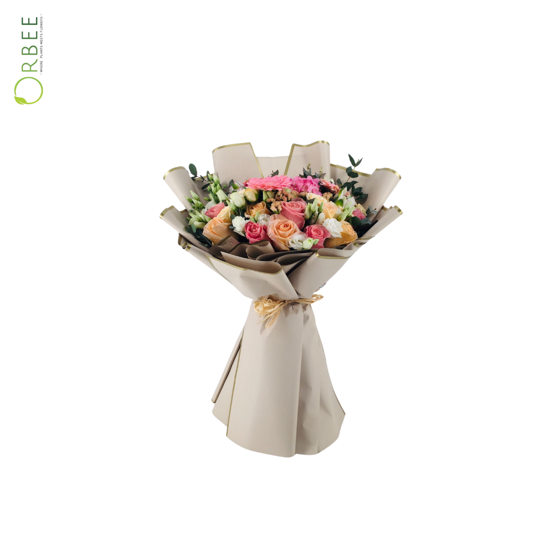 A lush and romantic bouquet featuring the timeless elegance of 20 roses complemented by 4 lisianthus blooms. The addition of 2 delicate baby roses, 3 germinis, and 3 alstroemerias brings in bursts of color and texture. With 3 statice stems adding a touch of whimsy and a single, captivating hydrangea as the focal point, this arrangement exudes charm and sophistication, perfect for expressing heartfelt emotions or celebrating a special occasion.