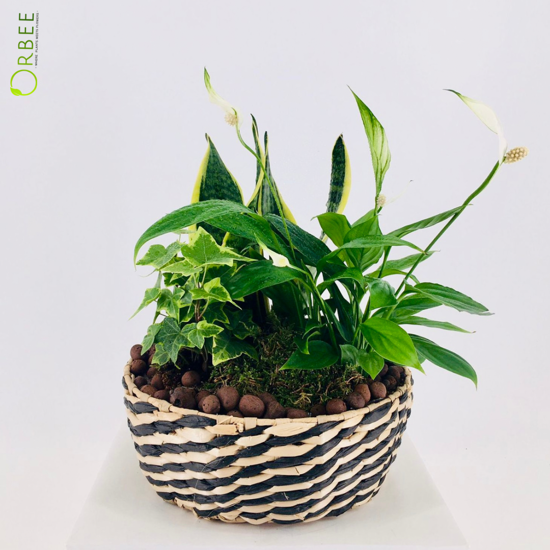 Sansevieria trif futura superba, Peace Lily, Hedera helix, brown stones, sheet moss, with black Jute basket.