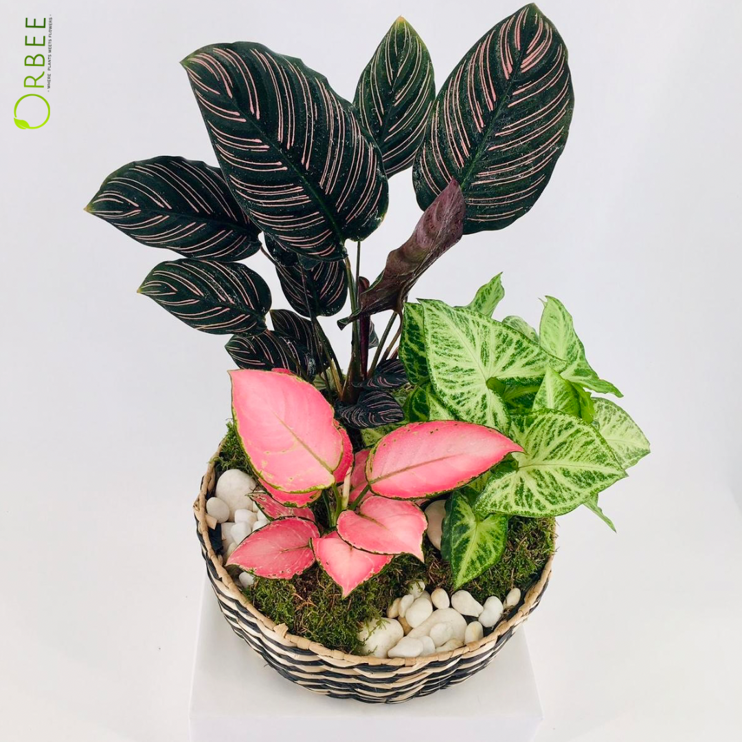 Calathea Sanderiana, Aglaonema pink, Syngonium arrow, sheet moss, white pebbles, with black Jute Basket.