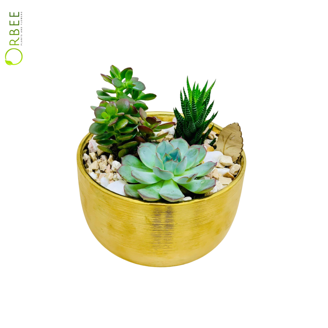 A stunning blend of assorted succulents thoughtfully arranged in a luxe golden pot — perfect for brightening up your table or gifting a touch of green elegance. Carefully curated with decorative stones and natural textures to bring nature's calm into your space.