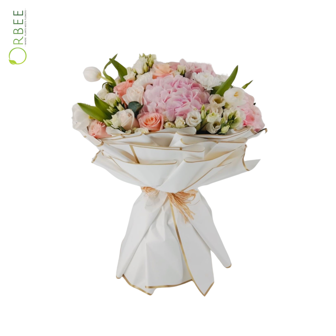 A luxurious masterpiece of floral elegance, this hand bouquet is a harmonious blend of 25 vibrant roses, 7 delicate baby roses, 4 lush hydrangeas, 8 frilly carnations, 5 elegant lisianthus blooms, and 5 graceful tulips. Accented with the fresh, aromatic greenery of eucalyptus (1/2 bunch), this bouquet is a symphony of colors, textures, and fragrances. Perfect for grand celebrations, heartfelt gifts, or romantic gestures, it’s a stunning arrangement that conveys beauty and sophistication in every petal.