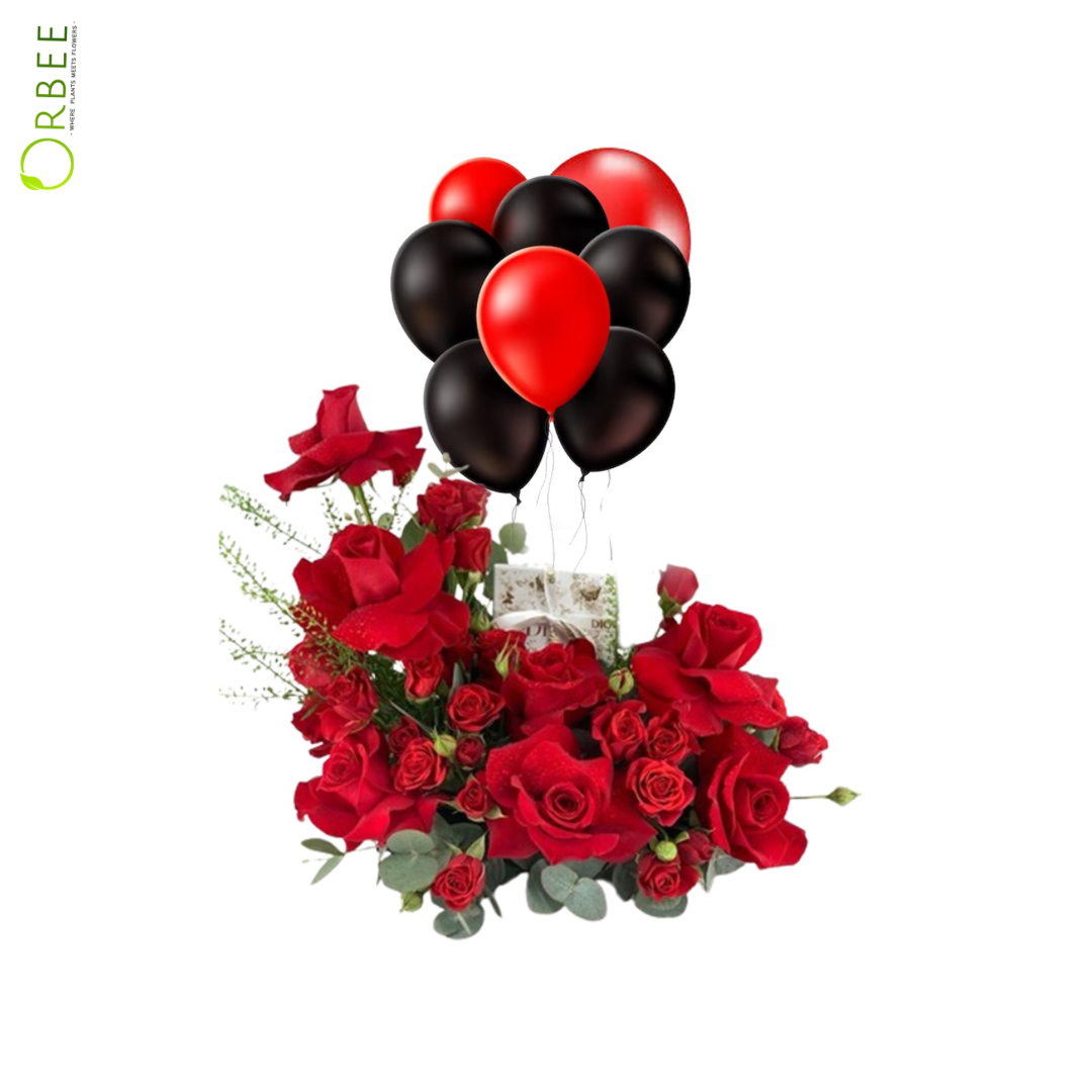 12pcs Red roses, 5pcs of spray roses, 1pc of lipedium and green leaves with flower box + 8nos of latex balloons