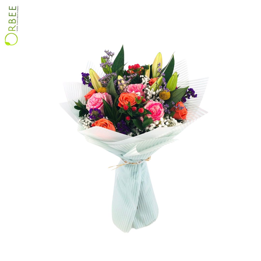 Experience the regal beauty of our "Majestic Blooms Harmony Bouquet," a captivating arrangement that weaves together the richness of 15 resplendent roses, the grandeur of 3 lilies, the everlasting charm of 3 statice, the delicate allure of 3 limonium, and the warmth of 3 hypericum. Adorned with fillers of gypsophila and leaves, this exquisite bouquet is lovingly wrapped in a sheet, creating a majestic presentation that resonates with grace and opulence.