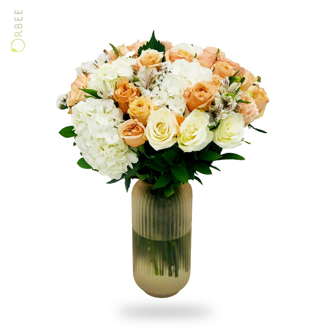 A captivating ensemble of elegant roses, vibrant alstroemeria, lush hydrangeas, and green leaf fillers, beautifully arranged in a glass vase. This arrangement transports you to a world of blooming serenity. This arrangement finds its place in various settings. Illuminate your dining table as a centerpiece, enliven your entryway, or grace your living room with its harmonious presence. Whether celebrating cherished occasions, expressing heartfelt emotions, or enhancing your surroundings, this arrangement is a gift that encapsulates the delicate balance of nature's beauty.
