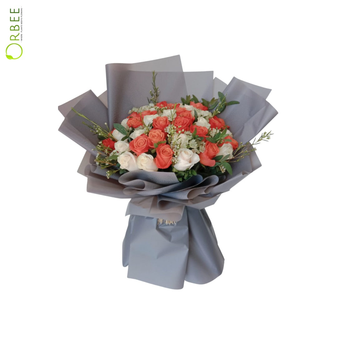 Description: 30 pc Orange & White Roses, 3 pc Astrantia, 2 stem Wax, fillers of green leaves, with wrapping sheet