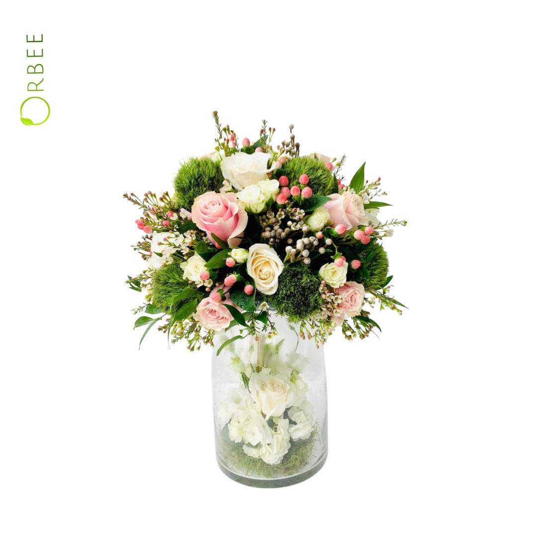 A captivating blend of classic roses, delicate spray roses, charming dianthus, vibrant hypericums, intricate wax flowers, lush hydrangea, and fresh green leaf fillers, thoughtfully arranged in a crystal clear glass vase. This arrangement encapsulates the essence of harmonious beauty. Display it on your dining table for an exquisite centerpiece, on your mantel to elevate your living room, or on your side table to add a touch of charm. Perfect for celebrating cherished moments, expressing heartfelt emotions, or enhancing your living space.