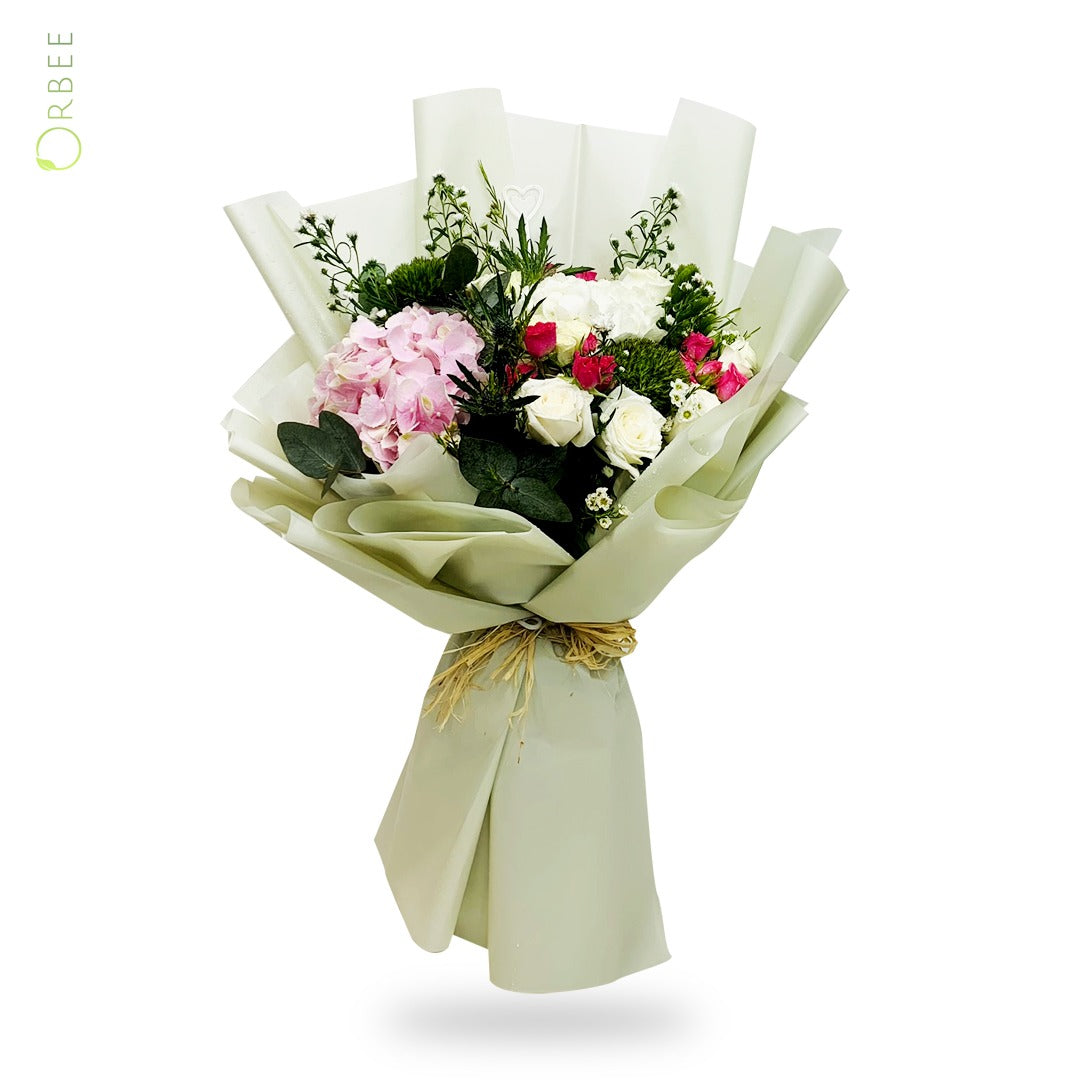 Experience the enchantment of emotions woven into petals with our captivating "Rockingyou!" Flower Bouquet. This exquisite arrangement brings together the timeless allure of white roses, the delicate charm of pink spray roses, the romantic grace of dianthus, the ethereal beauty of hydrangea, the vibrant energy of aster flowers, and the lush embrace of green leaf fillers. From anniversaries to expressions of love, the "Rockingyou!" bouquet is a symphony of feelings that resonates with those special occasions that deserve to be cherished forever.
