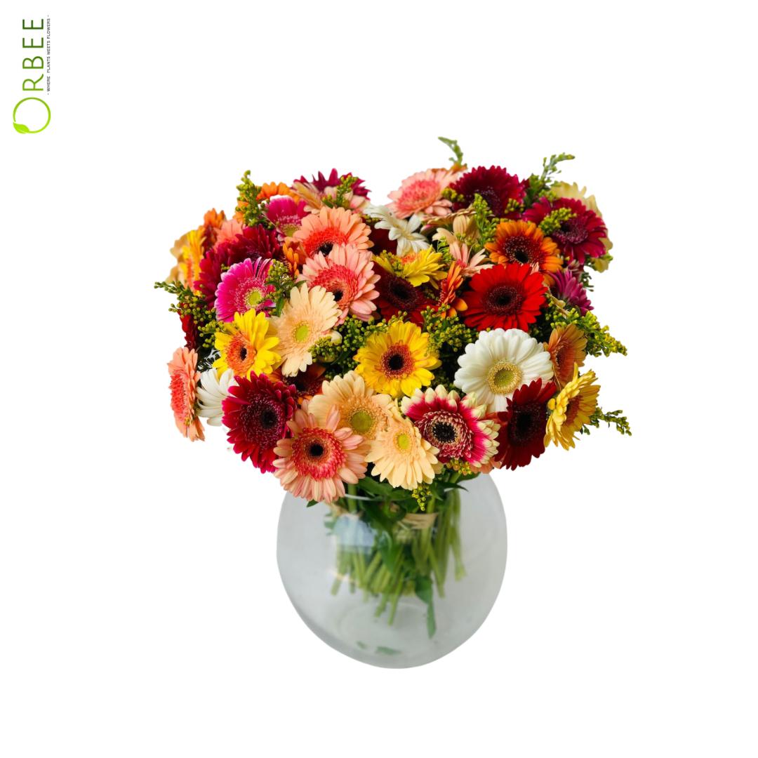 A captivating combination of vibrant gerbera daisies and sunny solidago thoughtfully arranged in a radiant glass vase. This arrangement captures the essence of joy and serenity, making it an ideal choice for various occasions. Place it on your kitchen countertop to infuse your space with joyful energy, on your living room side table to welcome guests with cheer, or on your office desk to cultivate an atmosphere of positivity. Gift this Summer Phenomenon arrangement to spread joy, happiness, and positivity. Its radiant blooms are a reflection of the bright emotions you want to convey.