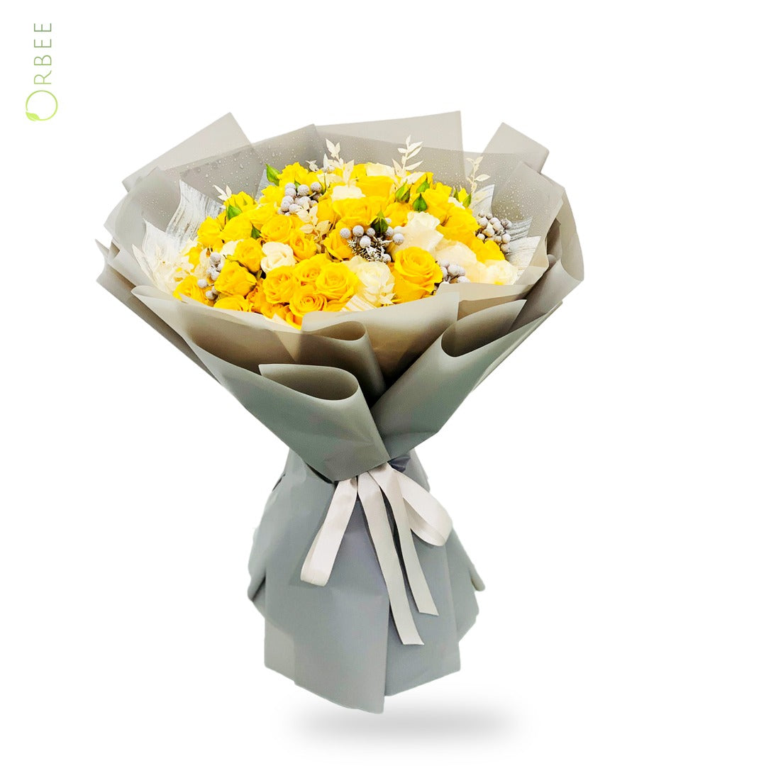 A stunning fusion of pristine white and sunny yellow roses, cheerful yellow spray roses, delicate brunia accents, and graceful Italian Ruscus fillers meticulously crafted to bring forth a sense of radiant tranquility. This bouquet is versatile and ideal for birthdays, expressions of gratitude, get-well wishes, or any moment you wish to infuse with a touch of radiant serenity. Gift this SunnyString bouquet to bring a smile to someone's day.