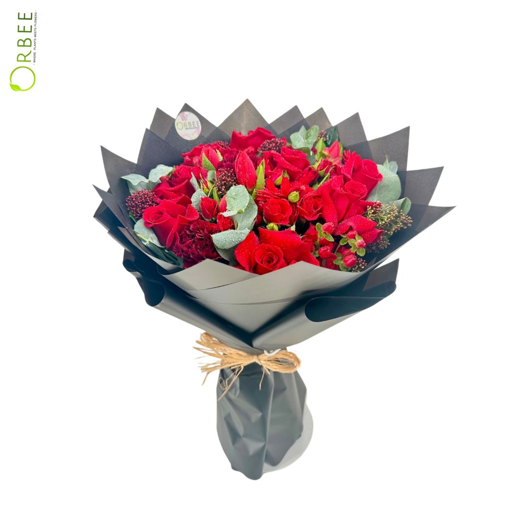 Immerse yourself in the timeless beauty of our "The essence of enduring love Bouquet," a captivating arrangement that combines the grace of 15 open roses, the innocence of 10 baby roses, and the delicate charm of 3 tulips. Adorned with lush fillers of leaves and wrapped in a sheet, this bouquet is a symphony of romance, capturing the essence of enduring love and natural beauty.
