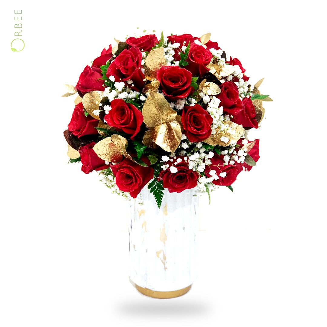 Introducing a harmonious blend of elegant roses adorned with gilded golden leaves and delicate gypso, gracefully presented in a sophisticated ceramic vase. This arrangement captures the essence of romance and opulence. This flower arrangement is perfect for expressing profound emotions, celebrating cherished moments, or enhancing your space with elegance.