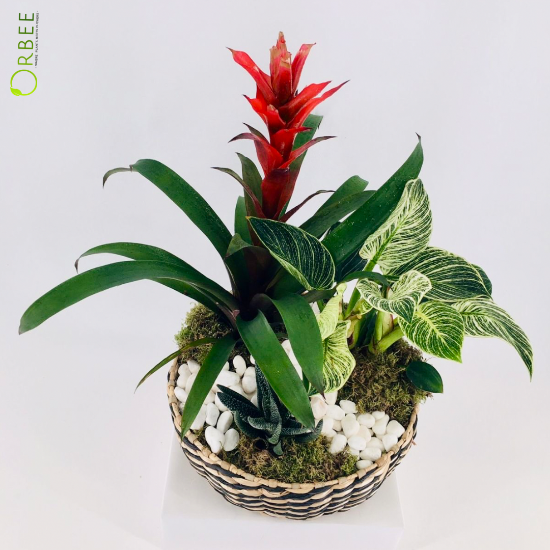 Guzmania Amoretto, Philodendron Birkin, Haworthia royal highness, sheet moss, white pebbles, with black Jute Basket.