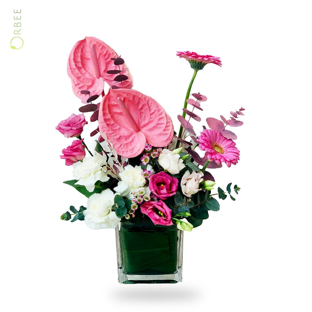 An elegant square vase arrangement includes exotic anthuriums, vibrant gerbera daisies, delicate carnations, lisianthus, and the charm of wax flower, thoughtfully arranged amidst lush green leaves in a crystal clear glass vase. This arrangement brings the enchantment of tropical beauty to your space. It's a perfect gift for grand celebrations, expressions of admiration, or to infuse your surroundings with tropical allure.