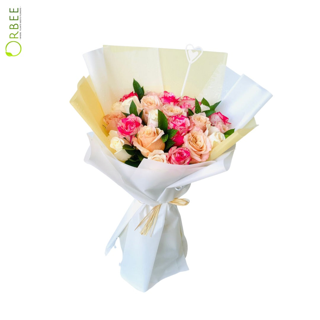 Experience the enchanting beauty of our Whispering Medley Bouquet, a captivating medley of mixed roses and lush ruscus foliage. This stunning arrangement brings together a delightful assortment of roses in various hues, complemented by the verdant charm of ruscus, creating a bouquet that radiates elegance and joy. This stunning bouquet is the perfect way to celebrate life's special moments and convey your love and appreciation. It is equally fitting as a centerpiece to brighten up any space or event, infusing it with an air of elegance and joy.
